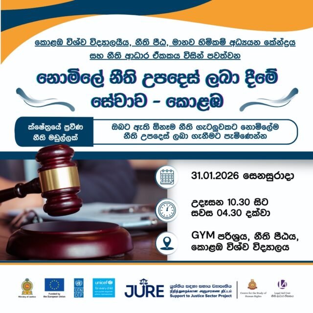 කොළඹ විශ්වවිද්යාලයේ නීති පීඨයේ මානව හිමිකම් අධ්යයන කේන්ද්රය සහ නීති ආධාර ඒ්කකය විසින් 2026 ජනවාරි මස 31 වන සෙනසුරාදා පෙරවරු 10.30 සිට පස්වරු 4.00 දක්වා නීති පීඨ පරිශ්රයේදී නොමිලේ නීති ආධාර කඳවුරුක් පැවැත්වීමට කටයුතු යොදා ඇත.