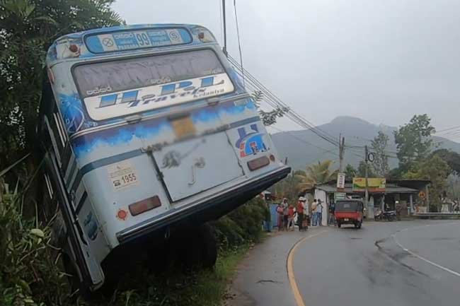 බස් රථය මාර්ගයෙන් ඉවතට පැන එහි ඉදිරිපස කොටස ප්රපාතයකට ලිස්සා ගොස් ගසක ගැටී නතරවී ඇති බව අප වාර්තාකරු පවසයි.