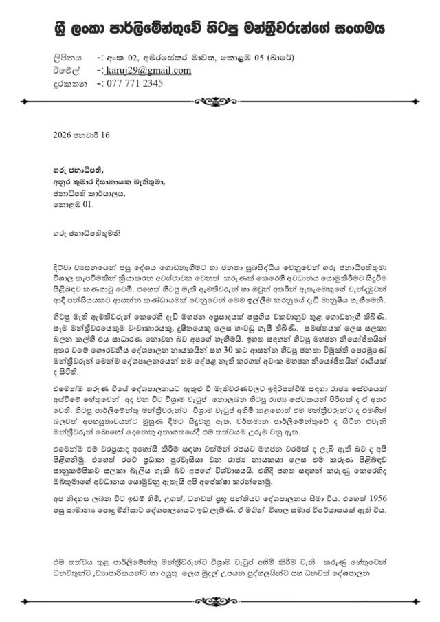 දිට්වා ව්‍යසනයෙන් පසු දේශය ගොඩනැගීමට හා ජනතා සුබසිද්ධිය වෙනුවෙන් ගරු ජනාධිපතිතුමා විශාල කැපවීමකින් ක්‍රියාකරන අවස්ථාවක වෙනත්  කරුණක් කෙරෙහි අවධානය යොමුකිරීමට සිදුවීම පිළිබඳව කණගාටු වෙමි. එහෙත් හිටපු මැති ඇමතිවරුන් හා ඔවුන් අතරින් ඇතැමෙකුගේ වැන්දඹුවන් ආදී පන්සියයකට ආසන්න කණ්ඩායමක් වෙනුවෙන් මෙම ඉල්ලීම කරනුයේ දැඩි මානුෂිය හැඟීමෙනි.
