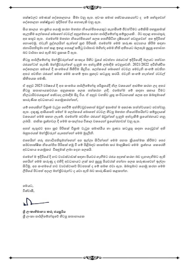 එම ලිපියේ වැඩිදුරටත් සඳහන්ව ඇත්තේ,