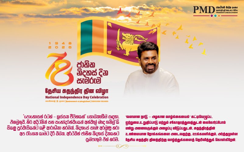 ගෙවුණු සියවසේ මඟහැරුණු ජයග්රහණ මෙරටට අත්කර දෙමින්, සියලු දෙනා එක්ව දකින සුන්දර සිහිනය වන ‘පොහොසත් රටක් – ලස්සන ජීවිතයක්’ ගොඩනැඟීම සඳහා, එකමුතුව, තිර අදිටනින් සහ සහෝදරත්වයෙන් අත්වැල් බැඳ ගනිමු’යි සියලු පුරවැසියන්ට යළි ආරාධනා කරමින්, නිදහසේ සැබෑ අරමුණු කරා අප රැගෙන යාමට දිරි වඩන, අර්ථවත් ජාතික නිදහස් දිනයකට සුබපැතුම් එක් කරමි.