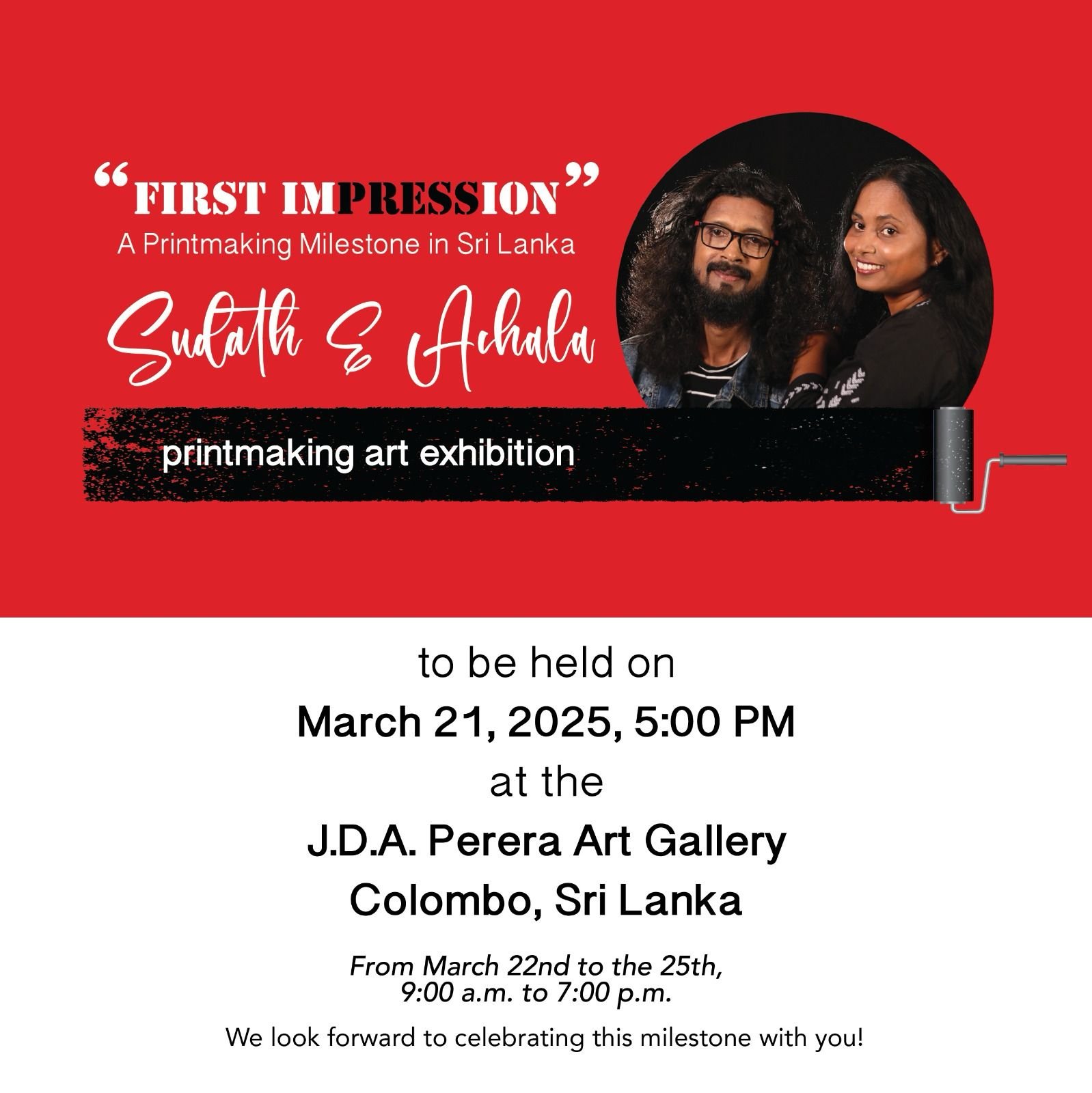 ලාංකේය Print making කලා මාධ්යයේ මං සළකුණක් සනිටුහන් කරමින් ප්රවිණ දෘශ්ය කලා ශිල්පී සුදත් අබේසේකර සහ ප්රවිණ දෘශ්ය කලා ශිල්පීණි අචලා ගුණවර්ධන සිත්තර යුවල ඉදිරිපත් කරන FIRST IMPRESSION A Printmaking Milestone in Sri Lanka සිතුවම් දැක්ම කොළඹ 7,හෝර්ටන් පෙදෙස, සෞන්දර්ය කලා විශ්ව විද්යාල දෘෂ්ය කලා පීඨයේ පිහිටි ජේ.ඩී.ඒ.පෙරේරා කලාගාරයේ දී මාර්තු 21 වැනිදා ප.ව. 5 ට විවෘත කෙරේ. ප්රදර්ශනය මාර්තු 25 වැනිදා තෙක් පෙ.ව.9 සිට ප.ව.7 දක්වා කලා රසිකයන් සඳහා විවෘතව පවතී.